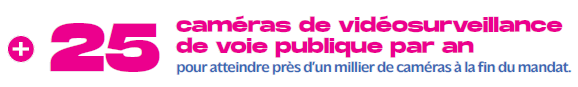 Installer 25 caméras de vidéoprotection supplémentaires par an sur la voie publique, soit environ 150 caméras sur un mandat complet qui s'ajouteront aux 800 caméras (600 de surveillance de voie publique actuelle)